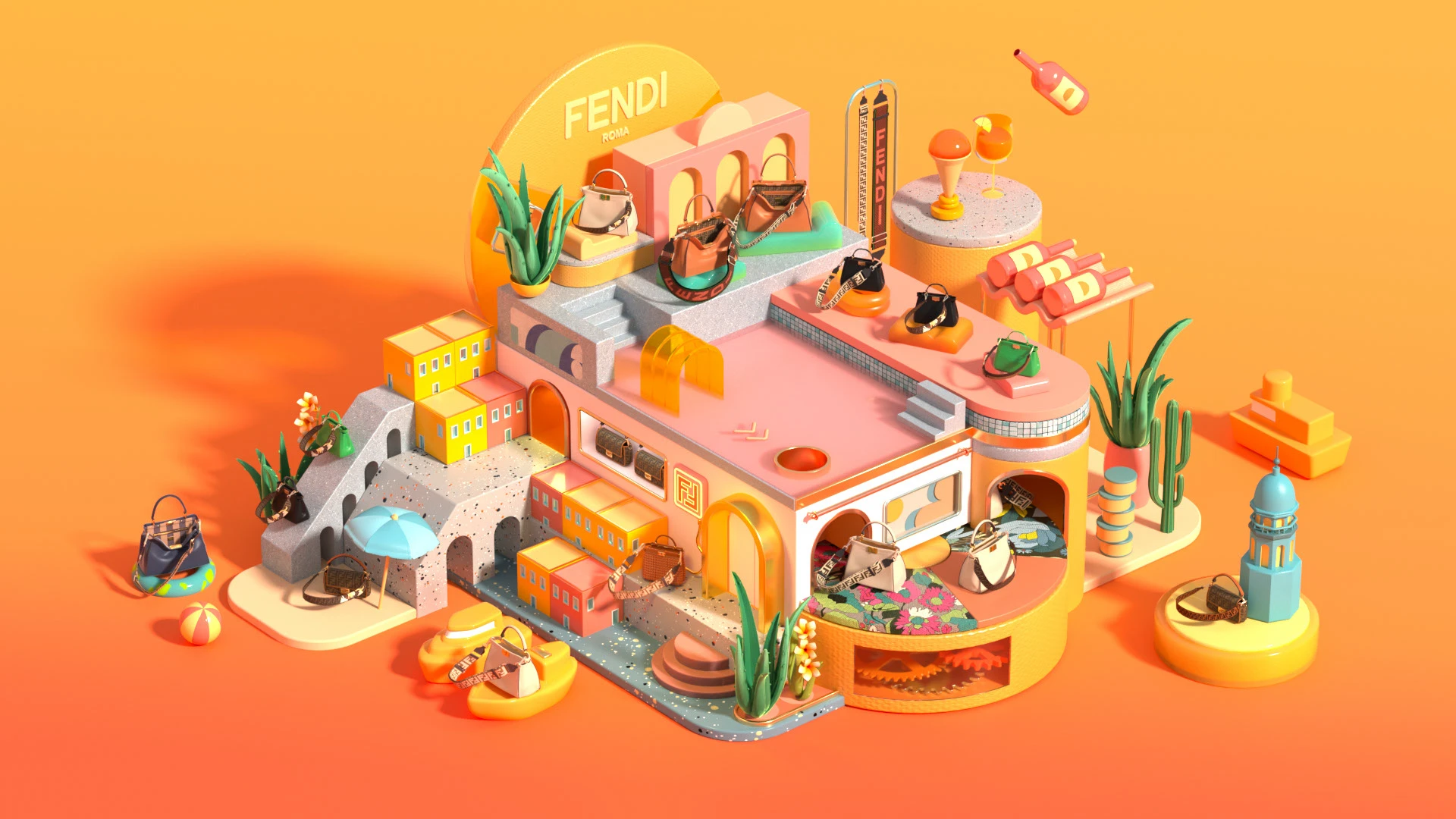 I designed an island based on their season concept “Holiday at the Ponza”. I built them in 3D and animated it.