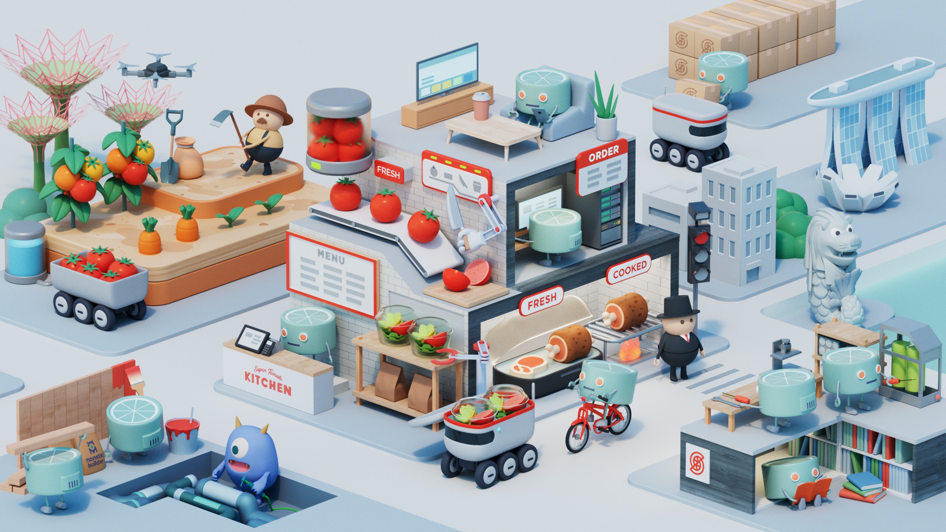 I designed miniature town in animated 3D to tell how Supertomato can change everyone’s life.